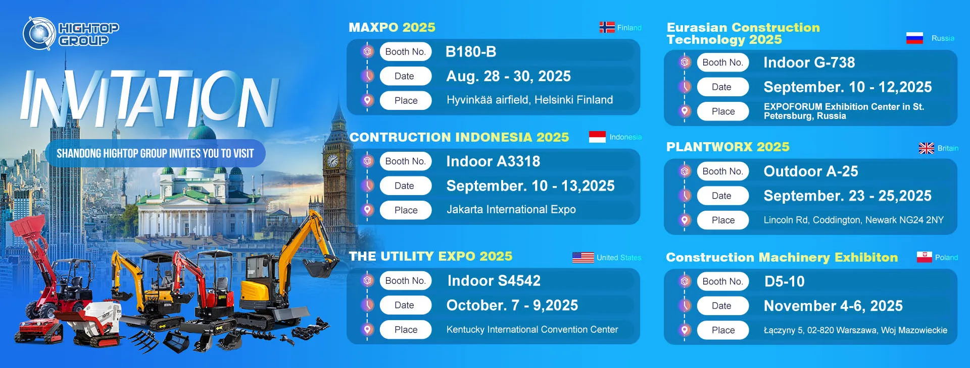 In August, the Nordic region is a picturesque destination. Shandong Hightop Group cordially invites you to attend the 2025 Nordic Finland International Construction Machinery Exhibition (MAXPO 2025) from August 28 to 30. Let’s meet at Hyvinkää Airport in Helsinki, Finland, at Booth B180-B to participate in this industry-leading event. Craftsmanship at Its Best, Inviting Your Appreciation At this exhibition, we will showcase several meticulously crafted engineering machinery masterpieces: HT15Pro Excavator >>Equipped with a Briggs & Stratton/Kubota engine, with a digging height of 0-2.69 meters and a digging depth of 0-1.7 meters, it offers flexible operation and is suitable for various complex working conditions. HT25 Excavator >> Equipped with a Kubota engine, with an operating height of 0-3.36 meters and a digging depth of 0-2.05 meters, it offers powerful performance and a wide range of applications. HTHY380T Loader >> Powered by a Runtong/Briggs & Stratton engine, with a lifting capacity of 0-380 kg and a working height of 0-2.12 meters, it features a multi-functional design and strong adaptability. GC550 Lawn Mower >>Equipped with a Longxin engine, one-button start, environmentally friendly and energy-efficient, easy to operate. HT500Y-5 Dump Truck >>Equipped with a Briggs & Stratton engine, load capacity of 0-500 kg, unloading height of 0-1.44 meters, hydraulic self-unloading design, compact and flexible, for quick transportation. Building friendships through exhibitions, collaborating for development Here, you will experience the beauty of mechanical craftsmanship up close; engage in in-depth discussions with technical experts on innovative concepts; gain access to cutting-edge industry information and trends; and explore the endless possibilities of mutually beneficial cooperation. Shandong Hightop Group is committed to providing customers with high-quality engineering machinery products and solutions. Mark your calendars for August 28-30 in Finland—we look forward to meeting you at MAXPO 2025 and working together to create a bright future!