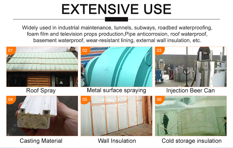 Widely used in industrial maintenance, tunnels, subways, roadbed waterproofingfoam film and television props production,Pipe anticorrosion, roof waterproof,basement waterproof, wear-resistant lining, external wall insulation, etc.