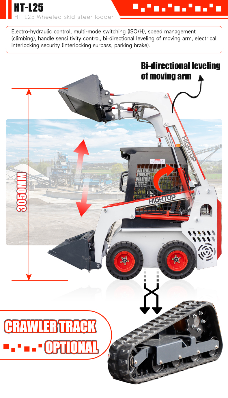 HT-L25 wheeled skid steer loader adopts luffing working arm, compact structure, strong applicability, and can play well in narrow situation operation with strong carrying capacity.