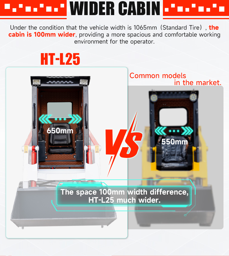 Under the condition that the vehicle width is 1065mm(Standard Tire) , thecabin is 100mm wider, providing a more spacious and comfortable workingenvironment for the operator.