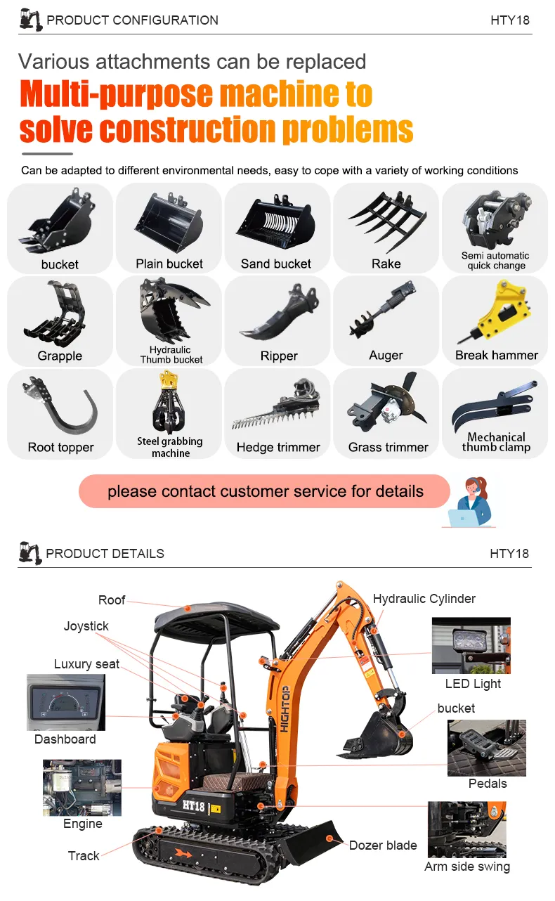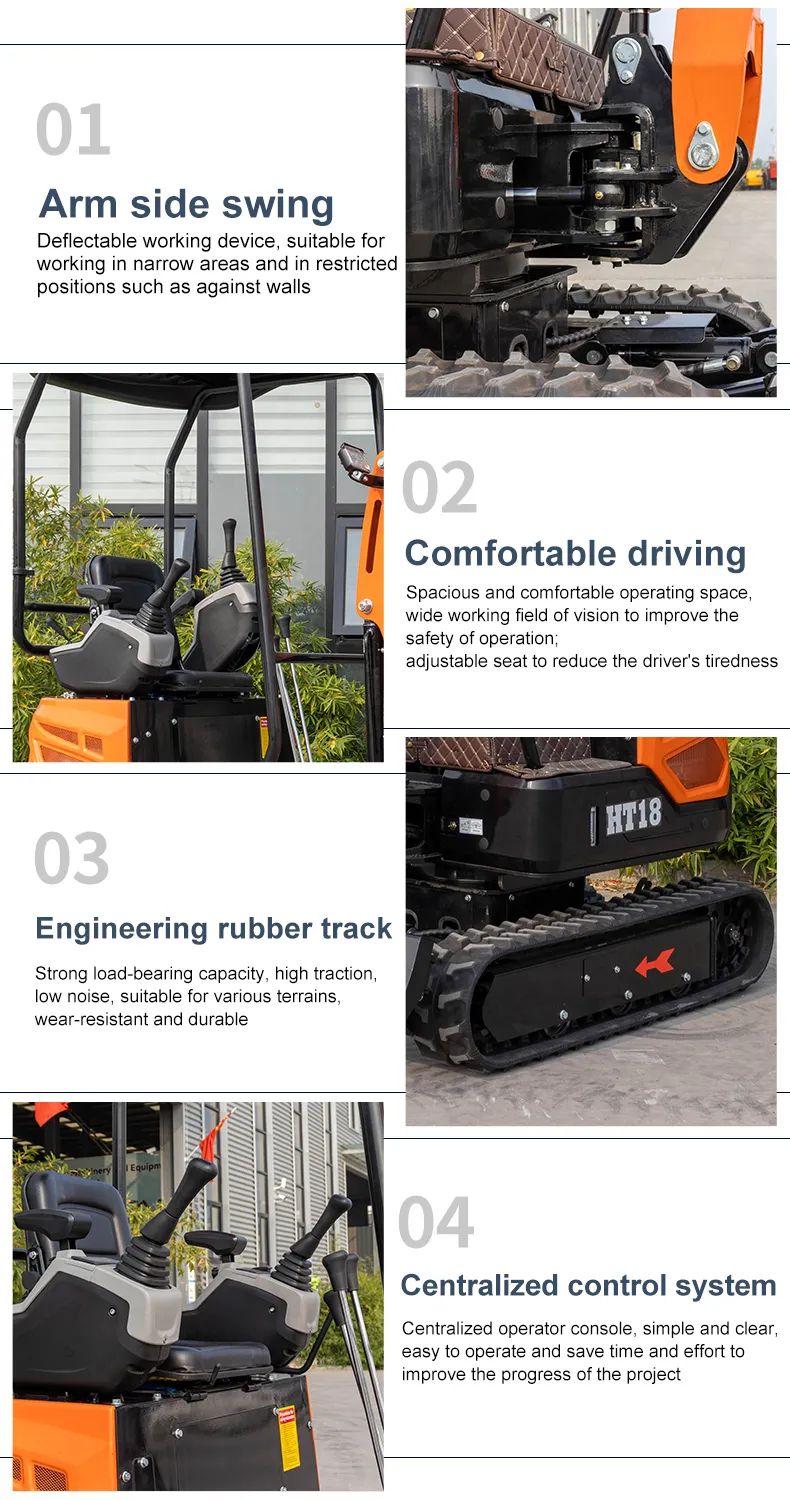 Multifunctional use: with digging, loading, leveling, earth-moving, crushing, ditching, drilling and other functions, through the quick replacement of accessories, can adapt to different working conditions, improve machine utilization. For example, in orchards, digging pits, fertilization, weeding and other operations can be carried out; In municipal engineering, it can be used for road repair, pipe trench excavation and material loading.