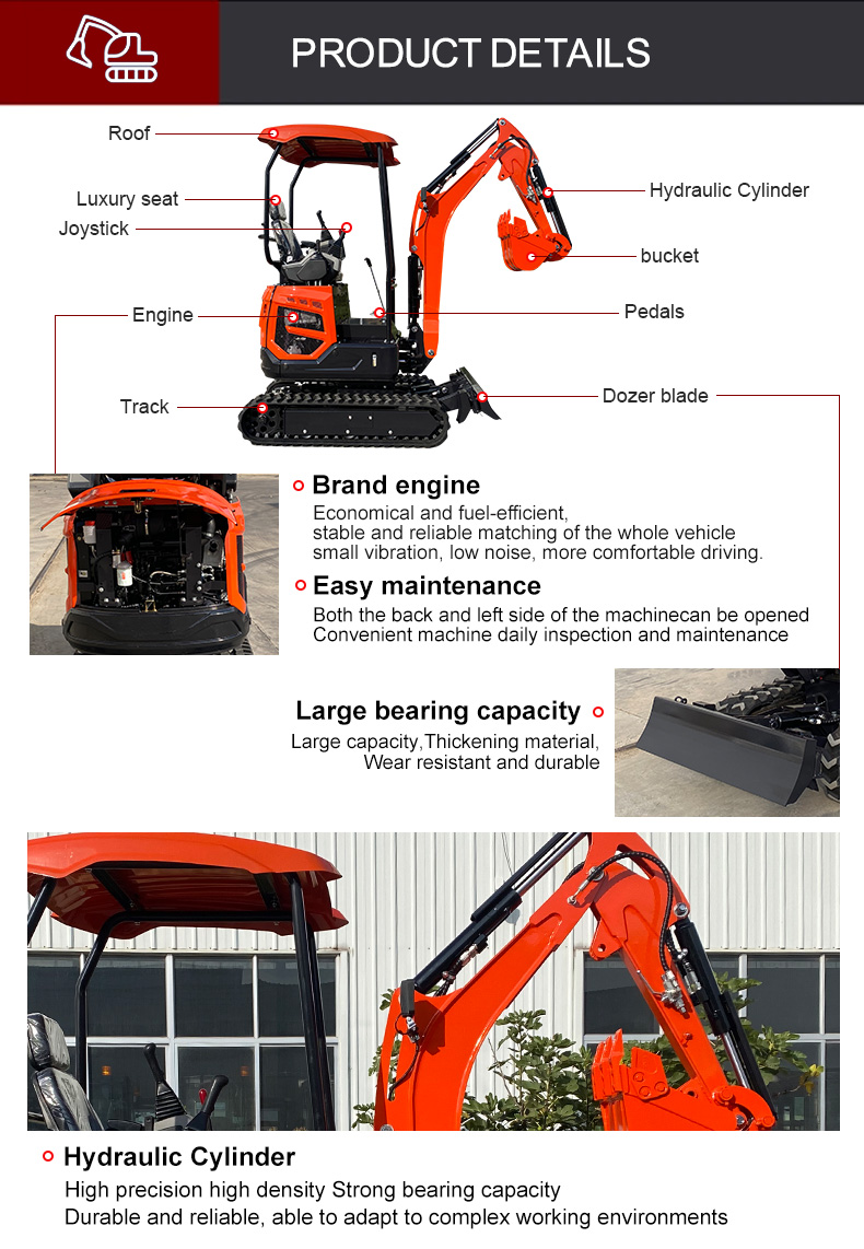 Roof,Luxury seat,Hydraulic Cylinder,Joystick,bucket,Engine,Track,Pedals,Dozer blade,Brand engine