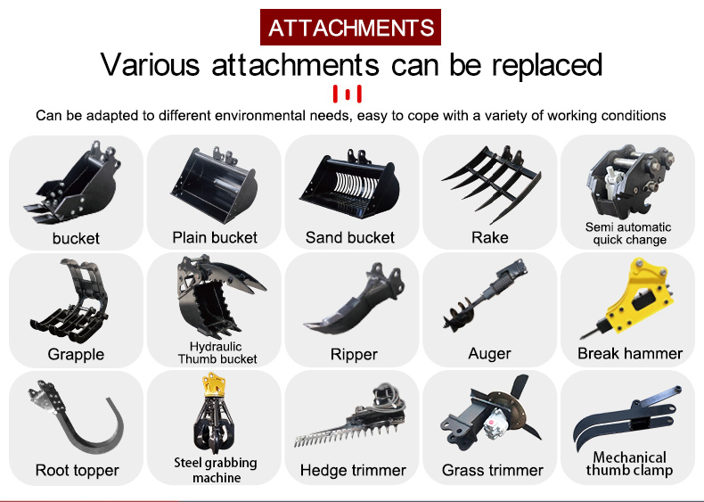 Bucket,Grapple,Plain bucket,Hydraulic Thumb bucket,Sand bucket,Ripper,Rake,Auger,Semi automatic quick change,Break hammer,Root topper,Steel grabbing machine,Hedge trimmer,Grass trimmer,Mechanical thumb clamp