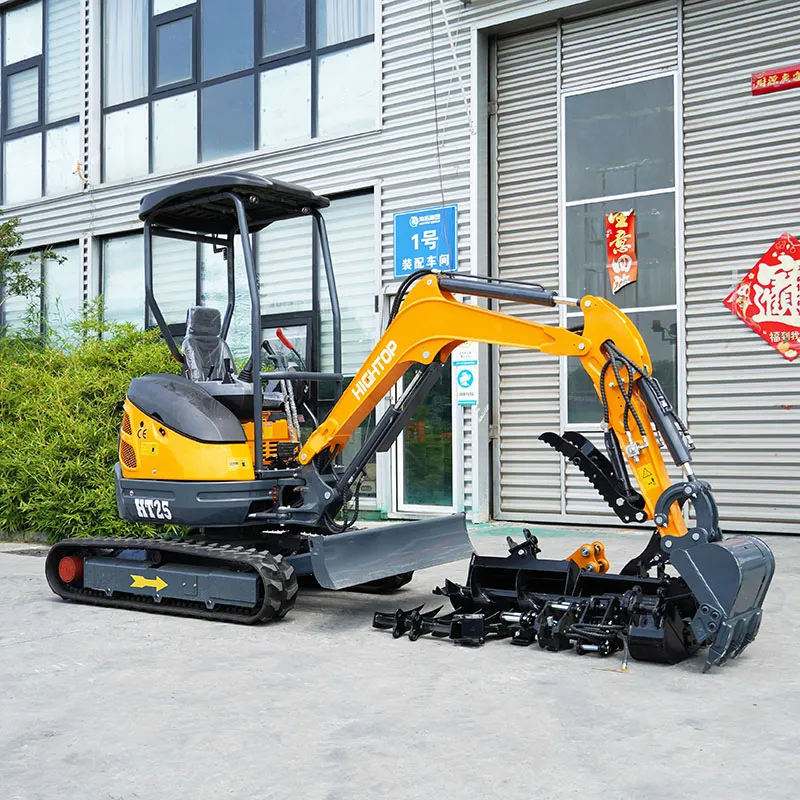 The exterior of the Hightop HT25 excavator is designed with sheet metal stamping molds for integrated forming, steel track walking tracks, using Japanese brand Kubota 1105 engine, and fully hydraulic pilot operation.