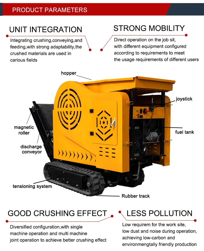 Hightop Jaw Crusher Equipped with sturdy rubber crawlers, this crusher enables direct operation on job sites without the need for complex relocation. It supports flexible customization with optional matching equipment, allowing users to tailor the setup to specific operational requirements. Key operational components including the hopper, control lever, magnetic roller, discharge conveyor, fuel tank, tensioning system and rubber crawler work in tandem to ensure smooth, efficient on-site operation.